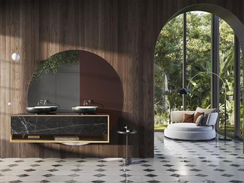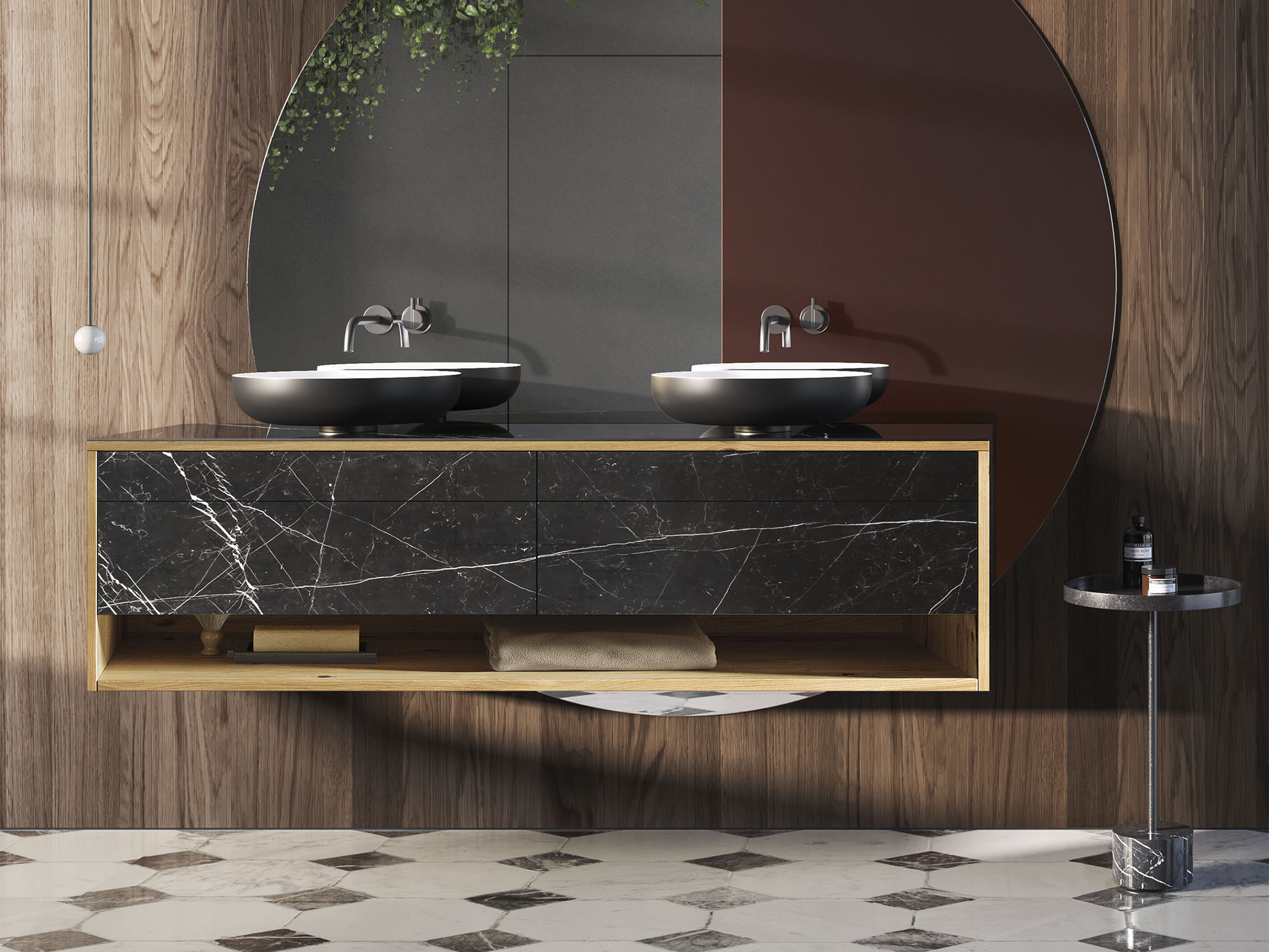 Bereits 1998 entstand Iris FMG© und ist berühmt für das Hightech-Erzeugnis technische Keramik, welches aus Sand, Ton und Mineralien bei Temperaturen über 1300°C, in einem patentrechtlich- geschütztem Verfahren, entsteht. „Maxfine“ von Iris FMG© ist innovativ, reproduziert naturgetreu schöne und seltene Marmor- und Steinsorten, ohne dabei Kompromisse einzugehen. Denn Sie bekommen eine absolut strapazierfähige Oberfläche, welche mit nur 6 mm Stärke sowohl auf der Waschtischplatte als auch auf den Fronten eingesetzt werden kann. Wer möchte kann die großformatigen Platten (300x150 cm) auch im Bad an Wand und Boden einsetzen und somit ein edles und zeitloses Traumbad ins Leben rufen.