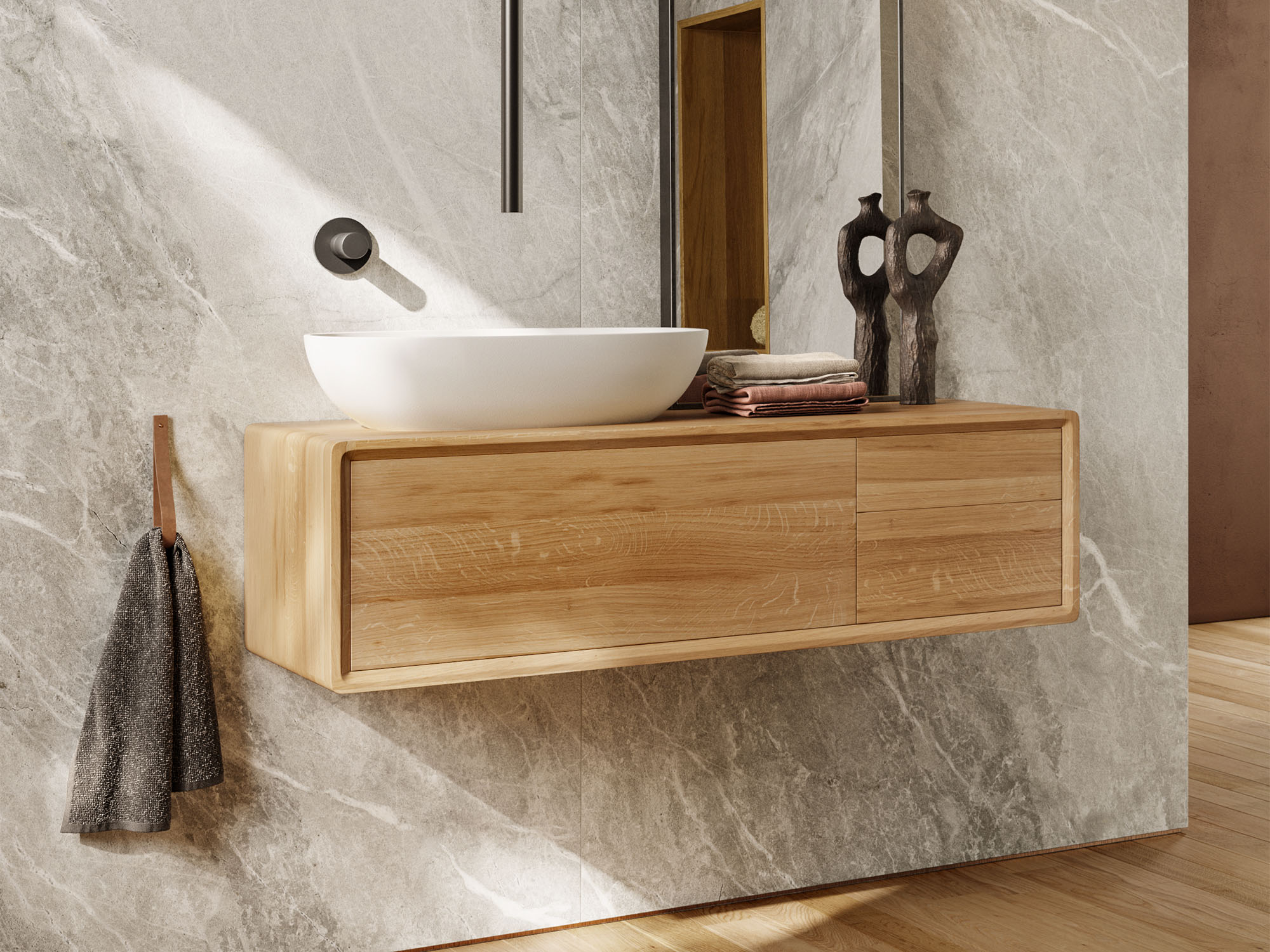 Seit 2007 spezialisiert auf Bad-Unterschränke aus Massivholz – Lapidispa® unterstützt Sie bei der Planung Ihres Traumbadmöbel und hilft tatkräftig mit dem Know-how von Tischlern und Badexperten. Bei der aktuellen Kollektion handelt es sich um Waschtischunterschränke aus massiver Eiche und europäischen Nussbaum, welche dann mit mehreren Schichten Lack speziell für den Nassbereich veredelt werden. Optional bietet Ihnen das norddeutsche Designlabel gegen Aufpreis eine Oberflächen-Veredelung aus Corian®, oder Keramik, an. Wer den angesagten Look von Marmor in seinem zu Hause möchte, wird die Veredelung mit einer hauchdünnen 6 mm Keramik-Oberfläche in Steinoptik lieben.