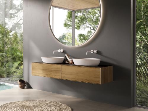 In der aktuellen Kollektion des norddeutschen Spezialisten für Massivholzmöbel haben Sie die Wahl zwischen Eiche und Nussbaum. "Siro" verkörpert den modernen und zeitlosen Waschtischunterschrank mit Bravour. 20 mm starkes Massivholz wird bestens sortiert von erfahrenen Tischlern, die ihr Handwerk beherrschen und mit Leidenschaft meistern. Eine eindrucksvolle Maserung des Holz aus nachhaltiger EU-Forstwirtschaft, welches mit einer 3-fachen Lackierung sorgfältig geschützt und auf seinen Einsatz im Bad vorbereitet wird. Die Technik der beiden Schubfächer ist vom renommierten Markenhersteller Blum® mit dem beliebtem Tip-On-Mechanismus, somit sind keine Griffe notwendig. Der feine, optisch nur ca. 7 mm breite Korpus, wirkt besonders edel und filigran.