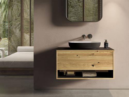 „Genero“ gehört zu den beliebtesten Waschtischunterschränken der Kollektion von Lapidispa®. Mit zwei Schubfächern versorgt er seinen Besitzer mit reichlich Stauraum, der Trick liegt beim offenen Fach, dies lässt den Unterschrank weniger schwer erscheinen. Übrigens fertigt Lapidispa® auch die Schubfächer standardmäßig aus Massivholz, nur der Schubfachboden wird mit leichtem Multiplex bestückt. Auf Wunsch gibt es auch die Möglichkeit einen schwarzen Bodenplatte aus MDF und, oder eine Facheinteilung für die Schubfächer zu bestellen. Hierfür wird ein Aufpreis berechnet. Grundsätzlich hat das Schubfach oben einen „U-Ausschnitt“, welcher den Anschluss eines Aufsatzwaschtisch ermöglicht. Sie sind unsicher, ob Ihr Waschtisch kompatibel ist? Schicken Sie uns einfach das Datenblatt (und ggf. die Ausschnittschablone) per E-Mail an verkauf@spa-ambiente.de. Unsere Tischler und geschulten Verkäufer prüfen dies umgehend und Sie erhalten eine verbindliche Auskunft.