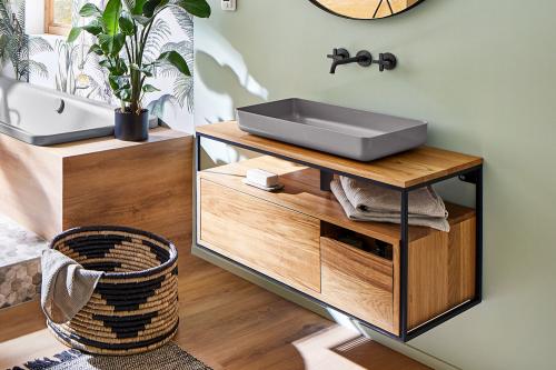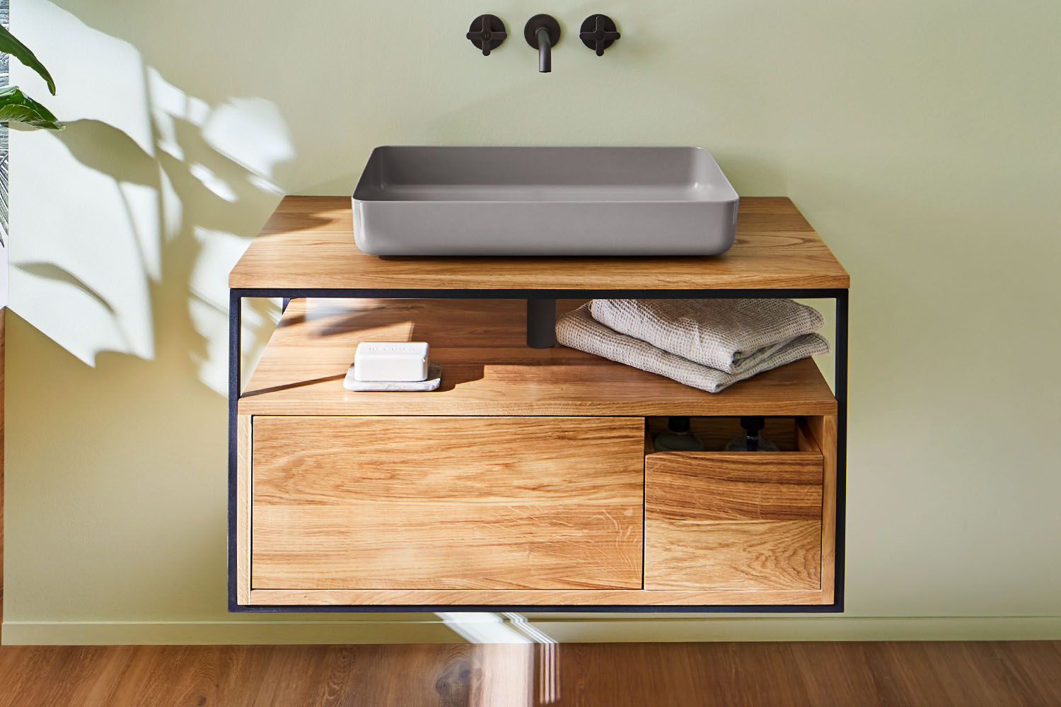 Absolut hochwertiges Badmöbel aus der Kollektion von Lapidispa®. Zeitlose, schöne Entwürfe der Designer, welche durch eine gelungene Auswahl von warmen Materialien und Farben einen höchstmöglichen Wohlfühleffekt versprechen. Die lange Erfahrung des Herstellers spiegelt sich in der ausgezeichneten Qualität jedes einzelnen Möbelstückes wider. Bei den gezeigten Serien handelt es sich um Massivholzmöbel aus Eiche, welche mit mehreren Schichten Lack veredelt sind. Wer trotz bestmöglicher Verarbeitung und langjähriger Erfahrung im Bereich Massivholzmöbel skeptisch gegenüber einer Holzoberfläche im Nassbereich ist, kann optional eine Platte aus Corian® gewählt wählen.