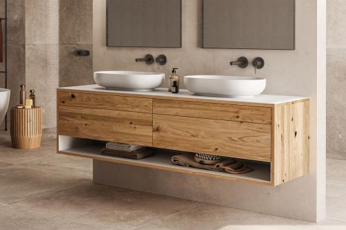 Seit 2007 spezialisiert auf Bad-Unterschränke aus Massivholz – Lapidispa® unterstützt Sie bei der Planung Ihres Traumbadmöbel und hilft tatkräftig mit dem Know-how von Tischlern und Badexperten. Bei der aktuellen Kollektion handelt es sich um Waschtischunterschränke aus massiver Eiche und europäischen Nussbaum, welche dann mit mehreren Schichten Lack speziell für den Nassbereich veredelt werden. Optional bietet Ihnen das norddeutsche Designlabel gegen Aufpreis eine Oberflächen-Veredelung aus Corian®, oder Keramik, an. Wer den angesagten Look von Marmor in seinem zu Hause möchte, wird die Veredelung mit einer hauchdünnen 6 mm Keramik-Oberfläche in Steinoptik lieben. „Genero“ mit Keramikveredelung finden Sie hier.